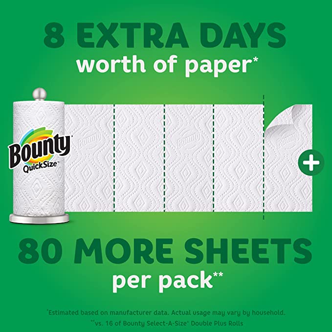 - This pack contains 40 more sheets per pack which means 5 extra days’ worth of paper vs. Bounty Select-A-Size 8 Huge Roll Estimated based on manufacturer data. Actual usage may vary by household