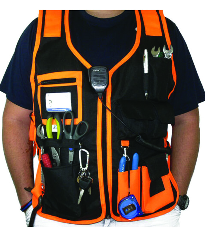 The JORESTECH® utility vest is perfect for any project. Made with extra heavy duty cordura nylon material and loaded with features this vest includes multiple loops and pockets for hammer, nails, flashlight, etc…, accessible pockets, gear loops, and clip points keep work gear secure and close at hand. Adjustable side straps to fit body size, zipper front closure, one size fits most (M – 2XL fit) Vest compatibility is buyers responsibility. Black with neon orange trim and two neon green reflective strips on the back of vest for high visibility.