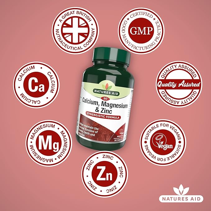 Natures Aid Calcium, Magnesium and Zinc combines three essential minerals into one easy to take tablet. Calcium helps to reduce the loss of bone mineral in post-menopausal women. Low bone mineral density is a risk factor for osteoporotic bone fractures. Calcium also contributes to the maintenance of Normal bones and teeth. Magnesium also helps support the maintenance of Normal bones and teeth, contributes to Normal muscle Function, and to a reduction in tiredness and fatigue. Zinc contributes to the maintenance of Normal bones, and to the maintenance of Normal hair, skin and nails. Just two tablets per day will provide the RDA of all these important nutrients. Suitable for vegetarians and vegans. 90 tablets. Directions for use: Take two tablets per day with food. Do not exceed the recommended intake. Ingredients: Calcium Carbonate Prep (Calcium Carbonate, Maltodextrin), Microcrystalline Cellulose, Magnesium Oxide, Zinc Gluconate, Anticaking Agent (Silicon Dioxide), Tablet Coating (Hydroxypropylcellulose, Hydroxypropylmethylcellulose), Calcium Citrate, Magnesium Citrate, Anticaking Agent (Vegetable Source Magnesium Stearate), Sodium Carboxymethylcellulose, Copper Gluconate.