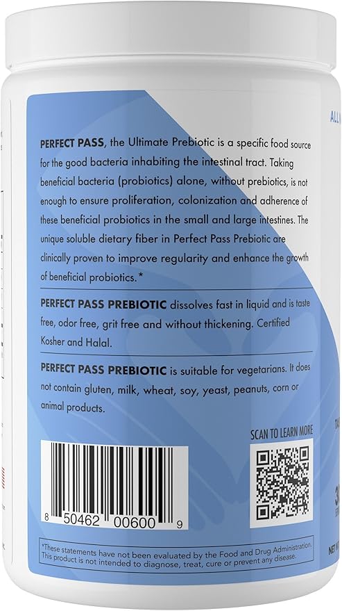 • Perfect Pass Prebiotic helps constipation and regulates diarrhea without excess gas, bloating or cramps.