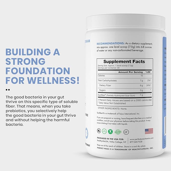 • Perfect Pass Prebiotic helps those suffering with gastrointestinal problems like IBS, crohn’s, colitis, diarrhea, constipation, leaky gut and general dysbiosis.