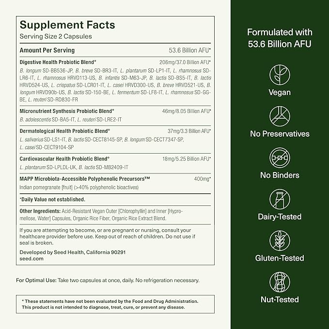 Digestive Health Probiotic Blend* (102mg/370. Billion AFU): Bifidobacterium longum SD-BB536-JP, Bifidobacterium breve SD-BR3-IT, Lactiplantibacillus plantarum SD-LP1-IT, Lacticaseibacillus rhamnosus SD-LR6-IT, Lacticaseibacillus rhamnosus HRVD113-US, Bifidobacterium infantis SD-M63-JP, Bifidobacterium lactis SD-BS5-IT, Bifidobacterium lactis HRVD524-US, Lactobacillus crispatus SD-LCR01-IT, Lacticaseibacillus casei HRVD300-US, Bifidobacterium breve HRVD521-US, Bifidobacterium longum HRVD90b-US, Bifidobacterium lactis SD-150-BE, Limosilactobacillus fermentum SD-LF8-IT, Lacticaseibacillus rhamnosus SD-GG-BE, Limosilactobacillus reuteri SD-RD830-FR. Micronutrient Synthesis Blend* (23mg/8.05 Billion AFU): Bifidobacterium adolescentis SD-BA5-IT, Limosilactobacillus reuteri SD-LRE2-IT. Dermatological Health Blend* (18mg/3.3 Billion AFU): Ligilactobacillus salivarius SD-LS1-IT, Bifidobacterium lactis SD-CECT8145-SP, Bifidobacterium longum SD-CECT7347-SP, Lacticaseibacillus casei SD-CECT9104-SP. Cardiovascular Health Blend* (9mg/5.25 Billion AFU): Lactiplantibacillus plantarum SD-LPLDL-UK, Bifidobacterium lactis SD-MB2409-IT. MAPP Microbiota-Assisted Polyphenolic Precursors (400mg): Indian Pomegranate [rind + aris] (>40% polyphenolic bioactives).